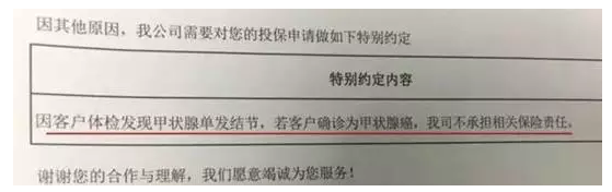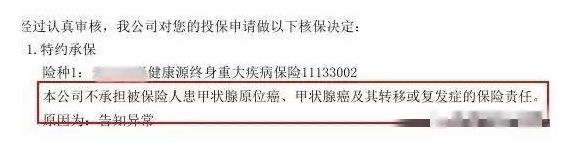 這是同方全球康健終身產(chǎn)品的除外承保的規(guī)定,上面的描述也很清楚,就是“甲狀腺原位癌,甲狀腺惡性腫瘤和轉移”不予承保,這就是甲狀腺原位延長癌癥相關責任,即只要是由于甲狀腺癌,其他類型的癌癥不包括在內(nèi),但不排除死亡和傷殘責任。對于大多數(shù)保險公司而言,這也是排除承保的正常處理方式。也許你會認為這看起來有點“殘忍”,但至少你還可以彌補你的死亡!下面的這種才算得上是終極除外,快隨多保魚繼續(xù)往下看!