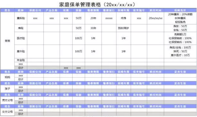 用這樣一張表格,我們可以清楚簡(jiǎn)潔地看到,家庭成員的保障情況,誰(shuí)還缺什么險(xiǎn)種,誰(shuí)的保額不足等等,都非常明朗。通過(guò)保費(fèi)總計(jì)來(lái)調(diào)整自己的預(yù)算,通過(guò)保額來(lái)判斷自己是否還需要再加保等,一張表格就能掌握全家的投保情況,是非常方便的。