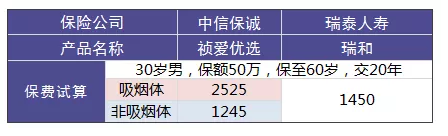 以中信保誠的禎愛優(yōu)選和瑞泰瑞和為例,兩款產品的免責條款都是3條。它們的費率比如下: