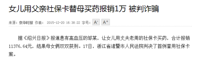 這不是危言聳聽。在2015年,就有新聞報(bào)道過,浙江一女子因冒用父親社保卡替母親買藥報(bào)銷,與母親被雙雙判刑。