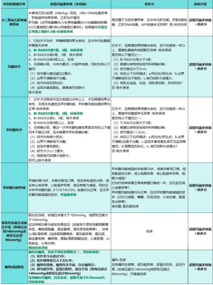 并且甲狀腺結(jié)節(jié)、乳腺結(jié)節(jié)1-2級(jí)可標(biāo)體承保,乙肝小三陽、高血壓、痛風(fēng)和甲減等滿足條件也是可以標(biāo)準(zhǔn)體承保的。
