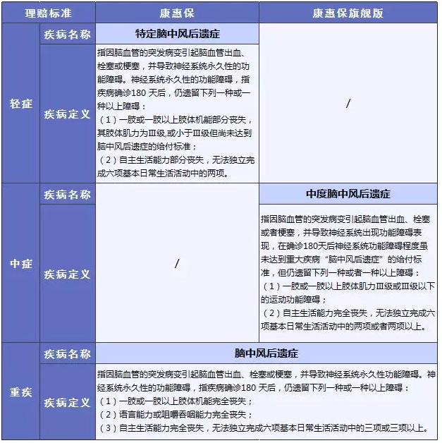 我們可以看見(jiàn),康惠保的輕度腦中風(fēng)后遺癥和旗艦版的中度腦中風(fēng)后遺癥的理賠標(biāo)準(zhǔn)是一樣的,但后者的理賠金額是大于前者。