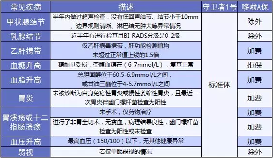 我們可以與哆啦A保簡(jiǎn)單做個(gè)對(duì)比,以下疾病守衛(wèi)者1號(hào)都可以正常承保,哆啦A保就會(huì)有一些限制。