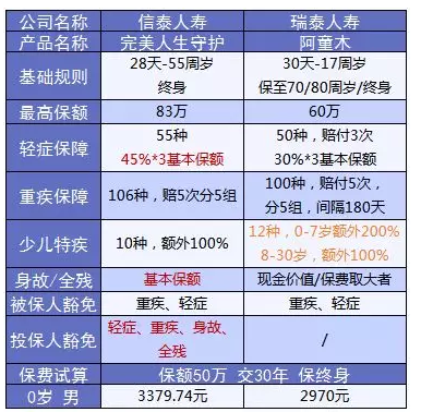 完美人生守護如果是給未成年人投保的話,特疾是必選的,那么在價格上會不會加價很多呢?這里跟瑞泰阿童木做個小對比: