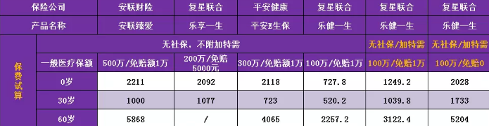 相同的10,000免賠額,沒有社保情況下樂健一生遠(yuǎn)低于其他三個。即使它為0免賠,附加特需醫(yī)療組合小于社保,另一個為保費(fèi)。
