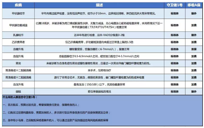 除了以上亮點(diǎn)之外,守衛(wèi)者1號(hào)本身還有另一個(gè)優(yōu)點(diǎn),就是它可以是智能核保,并且一直延續(xù)百年人壽的特性,核保相對(duì)寬松。甲狀腺結(jié)節(jié)、乳腺結(jié)節(jié)、乙肝攜帶者甚至輕微三高人群可根據(jù)標(biāo)準(zhǔn)體保險(xiǎn),簡(jiǎn)直就是這些輕度疾病患者的福音: