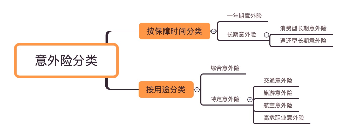 雖然意外險(xiǎn)相比健康險(xiǎn)不算復(fù)雜,但是意外險(xiǎn)種類繁多,下圖從保障期限和用途對意外險(xiǎn)做了簡單分類: