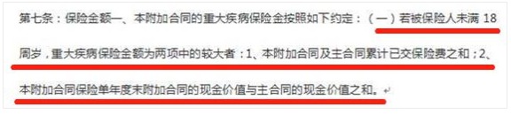 上邊的條款簡(jiǎn)單來說就是:18歲之前得大病,不賠錢,只退保費(fèi)?。?!