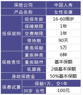 女性安康是一款團(tuán)體險(xiǎn),只針對(duì)女性特定疾病有保障,乳腺癌雙倍賠付,保障的內(nèi)容比較少,保額也不是很高,保險(xiǎn)期為一年,續(xù)保需要審核。