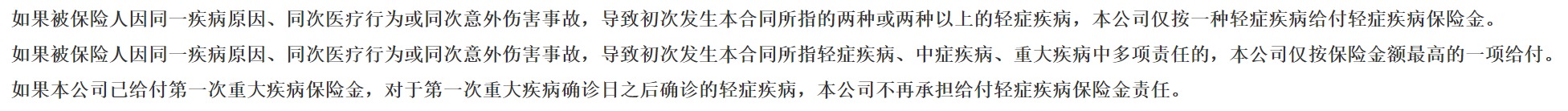 如圖里的輕癥疾病保障,沒有提及分組和間隔期等字眼,那就說明它的輕癥賠付不分組,沒有間隔期的。