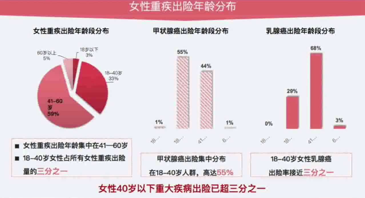 排名前三位的高危女性是甲狀腺癌,乳腺癌,肺癌。就業(yè)的年齡集中在41-60歲,18-40歲的女性已占到所有女性的重疾風險的三分之一。 18至40歲女性的乳腺癌風險率接近三分之一。