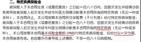 評論:該產(chǎn)品的輕癥由[特定疾病]的概念解釋,其實用[輕癥]概念更易于用戶理解。輕癥30種,支付1次,20%保證金額。輕癥的數(shù)量不是太小,但支付率太低。