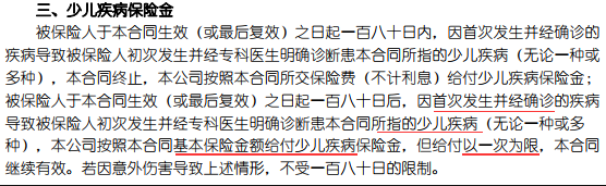 評論:估計為了使產(chǎn)品更具競爭力,該產(chǎn)品的精算師特別推出了“兒童疾病”的概念。事實上,這很奇怪。由于它被稱為康寧兒童的疾病,為什么我們要特別定義關(guān)于兒童疾病的部分?