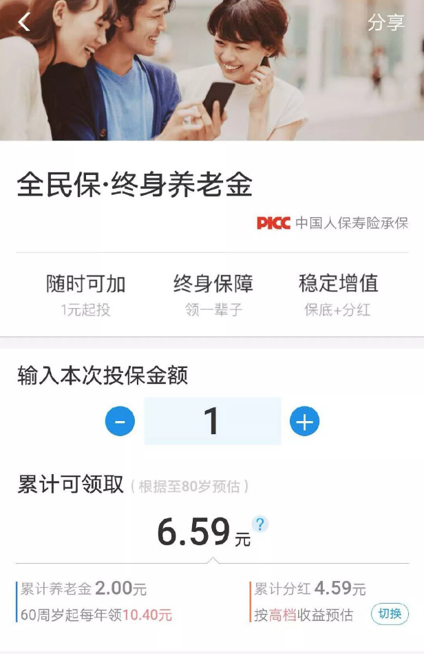 支付寶全民保·終身養(yǎng)老金,條款名叫:人保壽險聚財保養(yǎng)老年金險(分紅型)。背后的承保公司是中國人保集團的“人民人壽保險公司”,支付寶和他結合,可以被視為一個強大的聯(lián)盟。