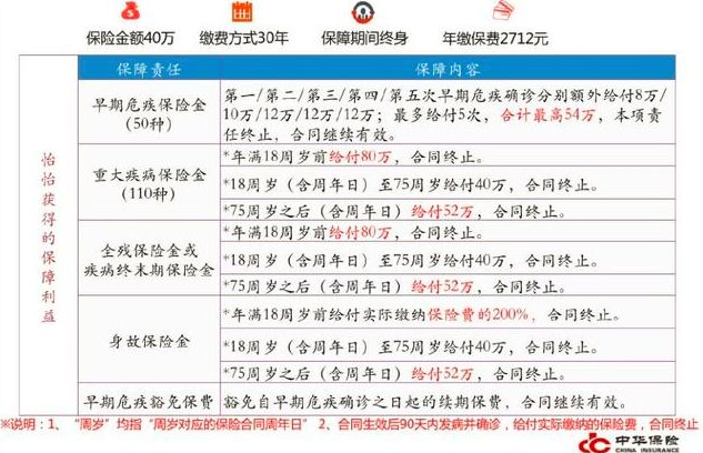 女嬰怡怡0歲投保40萬(wàn)重大疾病保險(xiǎn),保障終身,30年付款,保險(xiǎn)費(fèi)用年2712元,獲得保障如下圖所示: