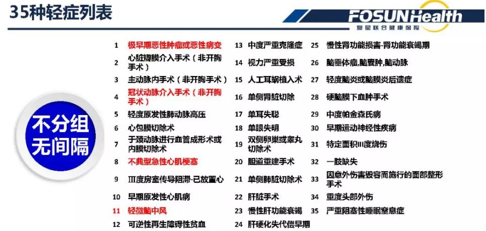 1、復星組合小保倍35種輕癥疾病包含輕癥,對應(yīng)于大多數(shù)高風險或相對高風險的輕疾。這確實更好。當然,我們必須知道所謂的輕癥也是一種非常嚴重的疾病,而不是日常小病。