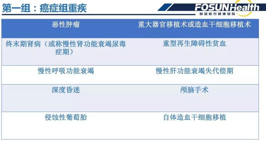 80種疾病分為2組。第一組10種疾病,包括惡性腫瘤、主要器官移植或造血干細胞移植、終末期腎病三大高危重大疾?。坏诙M70種疾病包括急性心肌梗死、腦中風后遺癥、冠狀動脈搭橋術(shù)3種高發(fā)疾病。