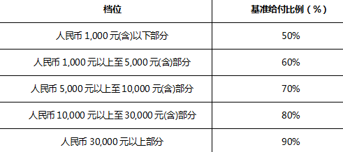 3、住院治療:每次事故100元,基準支付比例如下:(如果住院費通過社會保障或其他商業(yè)醫(yī)療報銷已達到70%以上,其余部分可能無法按照分級累進階梯給付,扣除免賠額后支付100%比例。)