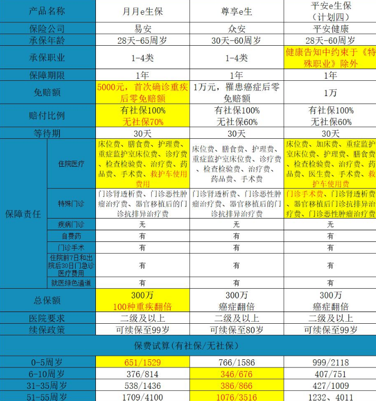這三種的總保險金額是杠桿,基本保險金額為300萬,但最大保險金額不同。月月e保是100種主要疾病,保險金額增加一倍并支付;尊享e生和平安e生保只是愛張翻倍,而保障之間的差異仍然完全不同。