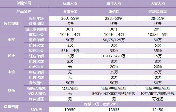 (3)如果追求高性價比:百年人壽康倍保保費是最貴的,但它高于天安人壽健康源,在第二次、三次輕癥和重病賠付比例是更高;弘康多啦A保最便宜,最重要的原因是它沒有中癥保障,遵循廉價的、足夠的邏輯,無論如何比較,從保費開支都是這里最低的。