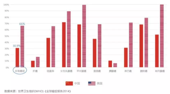 醫(yī)學(xué)上,5年生存概率通常用于衡量癌癥治療的效果。對(duì)于大多數(shù)癌癥治療,美國優(yōu)于中國。