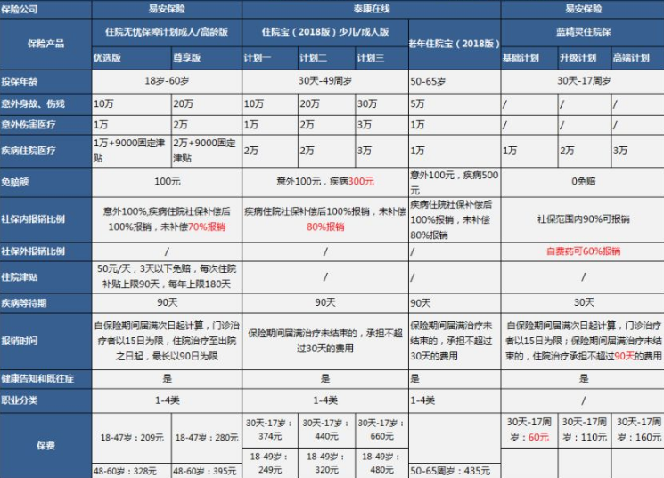 目前,線上有幾種小型醫(yī)療保險相對高質(zhì)量。他們分別是:易安住院無憂保障計劃、 泰康在線住院寶、 易安藍精靈住院保。對比圖如下: