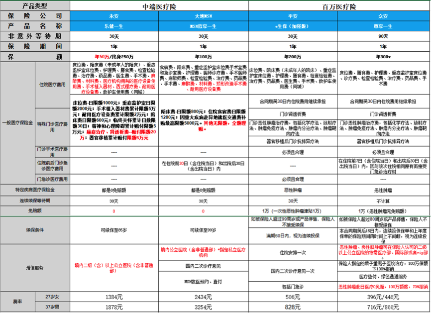 ? 隨著保險(xiǎn)行業(yè)的不斷發(fā)展,醫(yī)療保險(xiǎn)這個(gè)險(xiǎn)種也是更新?lián)Q代非常的快,從最初的小額醫(yī)療保險(xiǎn),到后來的百萬醫(yī)療險(xiǎn),中端醫(yī)療保險(xiǎn),高端醫(yī)療險(xiǎn),海外醫(yī)療險(xiǎn)等等。今天我們就來聊一聊最近非常火的百萬醫(yī)療險(xiǎn)和終端醫(yī)療險(xiǎn)分別是什么,已經(jīng)哪些人群適合百萬醫(yī)療險(xiǎn),哪些人群更適合中端醫(yī)療險(xiǎn)。為了方便對(duì)比,下圖是中端醫(yī)療險(xiǎn)和百萬醫(yī)療險(xiǎn)的產(chǎn)品對(duì)比。