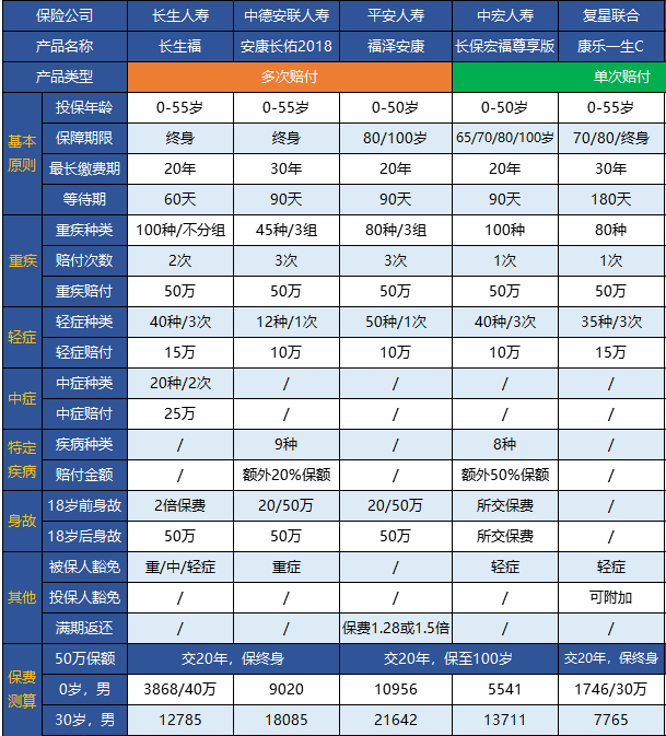 多寶魚建議:單次賠付和多次賠付實際上不用太過在意,首先一個人一生中罹患兩次重疾的概率還是比較小的;而且,如果多次賠付和多次賠付的價格差別比較大,完全可以用他們的差價買更得的多次賠付重疾險產品。所以多保魚還是比較喜歡康樂e生C款這個重疾險產品。