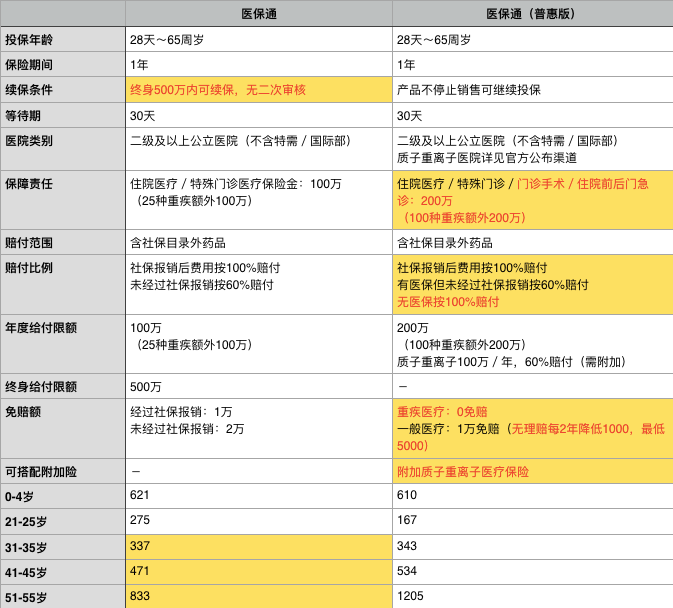 那么醫(yī)保通普惠版和醫(yī)保通有什么區(qū)別?更好嗎?還是不如上一版那樣,我編寫(xiě)了一張表。有優(yōu)勢(shì)的項(xiàng)目標(biāo)有黃色。項(xiàng)目?jī)?nèi)的優(yōu)化責(zé)任標(biāo)記為紅色,并且截取了幾個(gè)年齡組的費(fèi)率,這更直觀。