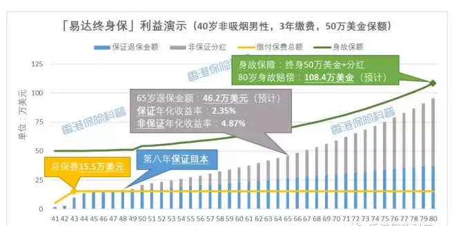 讓我們舉一個(gè)例子來看看「易達(dá)終身?!谷绾翁峁┮粋€(gè)帶有保單的“身故保障 +養(yǎng)老儲(chǔ)蓄+財(cái)富繼承”三種功效的。以下是該計(jì)劃的好處的示范(例如,一名40歲的非吸煙男子,死亡保額為0萬美元,3年繳費(fèi),每年5175美元,以及總共保費(fèi),三年約155,000美元):