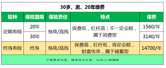 3、終身類型重大疾病保險(xiǎn)具有死亡責(zé)任具有壽險(xiǎn)功能,通常死亡保額不高,可以結(jié)合一個(gè)定期壽險(xiǎn),做足保額,定期壽險(xiǎn)杠桿高、保費(fèi)便宜。