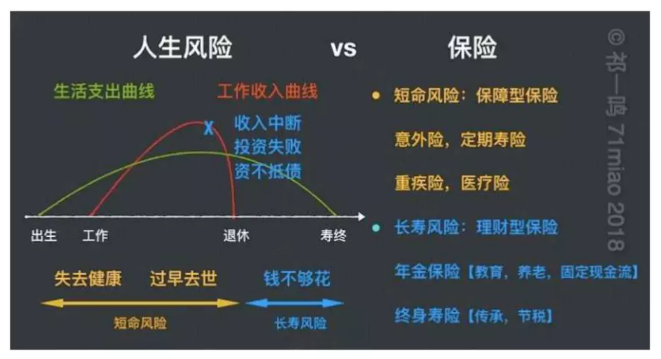 看第一張圖,綠線是支出曲線。在這一生中,人們在老了病的時候不得不花錢。如果退休后收入不夠,或者因為失業(yè)、投資失敗,這筆錢還不夠。我們稱之為長壽風險。它對應于金融保險,例如最常見的年金保險和終身壽險。
