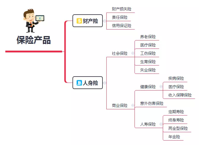 從上圖可以看出,保險(xiǎn)主要分為兩類:財(cái)產(chǎn)保險(xiǎn)和人身保險(xiǎn),然后又細(xì)分為小類。