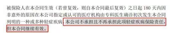 這意味著保險(xiǎn)單在等待期間確認(rèn)為輕癥,而保險(xiǎn)公司此時(shí)不是理賠,而是輕癥,但不會(huì)取消合同。如果發(fā)生輕癥并且合同終止,則不僅意味著理賠,而且將來也意味著保障。雙保護(hù)條款非常人性化,雖然這次輕癥不是賠付,但是合約沒有結(jié)束,保障總是存在的。