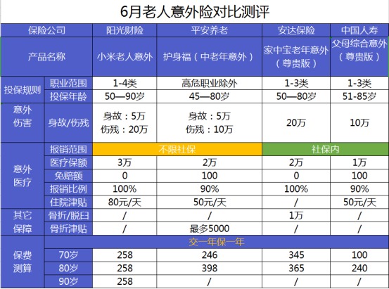 對于比較在意老年人意外身故保額的,可以考慮投保安達家中寶老年意外,最多可以買到20萬的保額。然而意外醫(yī)療只能報銷社保范圍內(nèi)的費用,比較在意報銷范圍的,可以考慮之前兩款產(chǎn)品。