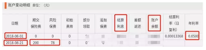 每月21日扣除保費(fèi)200元,其中 78元風(fēng)險(xiǎn)為保費(fèi),另一個(gè)進(jìn)入萬能賬戶余額,月利率于1日結(jié)算。實(shí)際結(jié)算年化利率為5%;