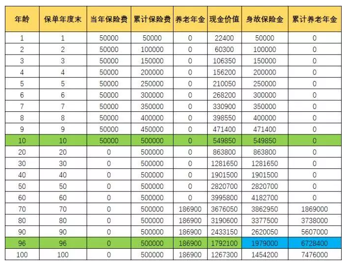 30歲安母親給她的兒子剛剛滿月安 小寶,投保天安生活故事福尊享,選擇10年支付,一年支付5萬元,總付費50萬元,選擇60歲領取養(yǎng)老金年金,基本保險金額18.69萬元,保險期限為終身。然后安 小寶從60歲開始,你可以每年領取186,900元作為家庭養(yǎng)老金補助,直至終身。假設安 小寶 96歲死亡,共收到36個養(yǎng)老金年金,共計678.44萬元,并給家人留下了179萬元。