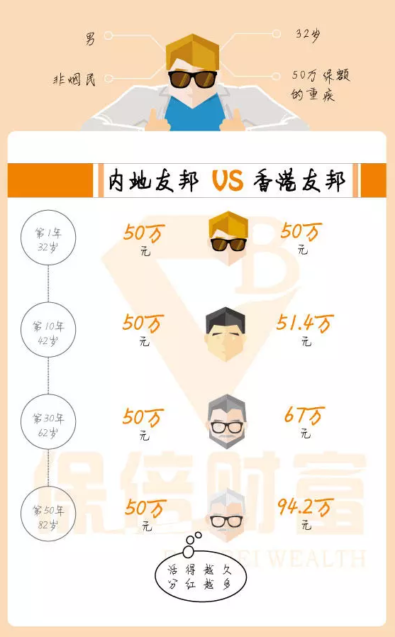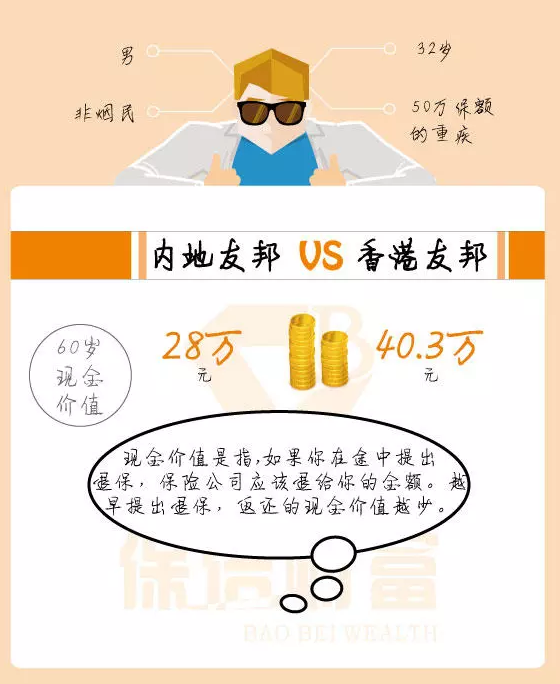 例如,被保險人是一名32歲的非吸煙男子,他想要支付50萬保額的嚴(yán)重疾病。他對友邦非常有信心并且最初準(zhǔn)備在內(nèi)地投保,但是一位朋友告訴他購買香港保險。便宜! 香港友邦相同的保額,保障更高,保費更低。