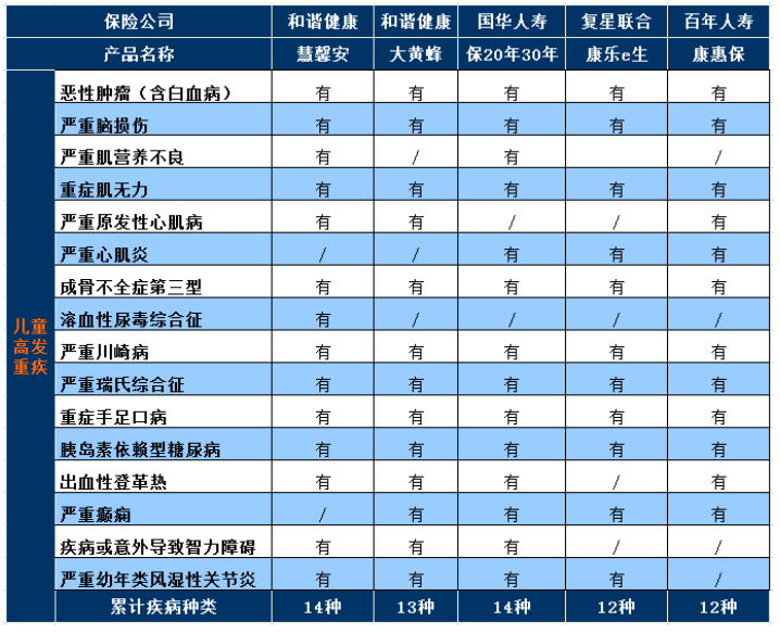 由于沒有統(tǒng)一的標(biāo)準(zhǔn),兒童特定嚴(yán)重疾病的分類并不統(tǒng)一。對(duì)于嚴(yán)重程度高和病情嚴(yán)重的兒童,上述產(chǎn)品與保障進(jìn)行比較如下: